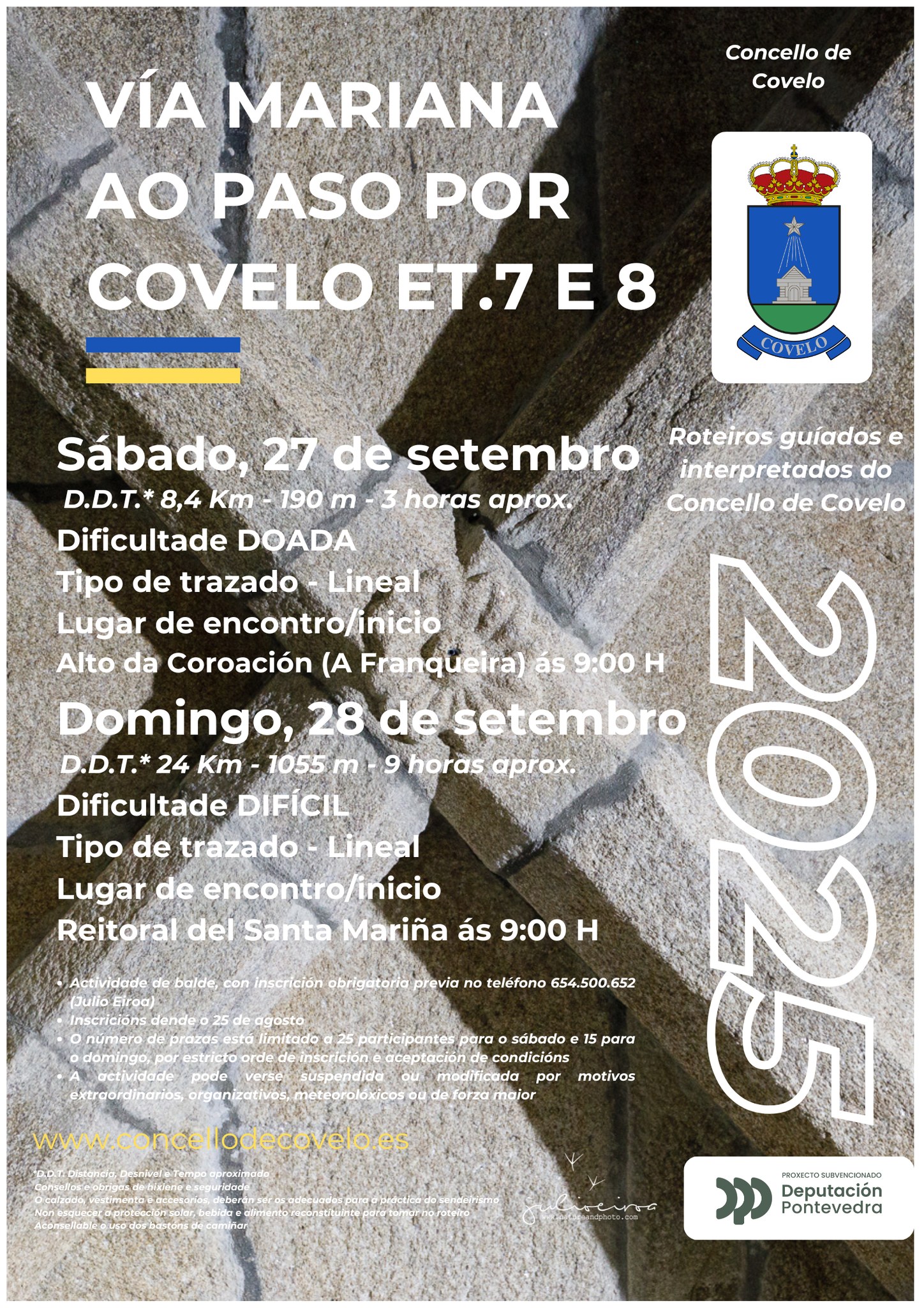 Las rutas guiadas del año 2025 son actividades turístico-deportivas del Ayuntamiento de Covelo y Diputación de Pontevedra, guiados por el guía de montaña, biólogo y fotógrafo Julio Eiroa. Inscripciones e información desde el lunes 22 de septiembre hasta agotar las plazas en el teléfono 654.500.652.