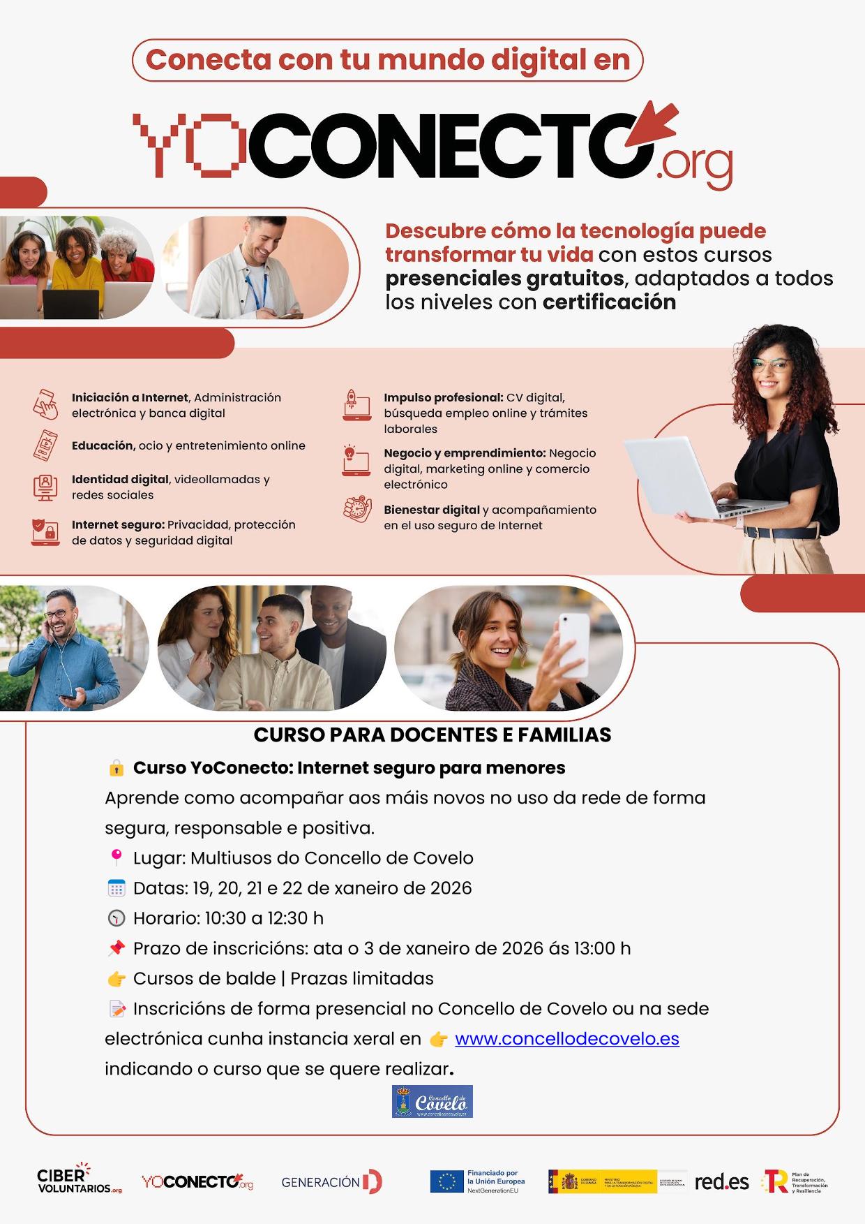 Inscripciones de forma presencial en el Ayuntamiento de Covelo o en la sede electrónica con una instancia general en www.concellodecovelo.es indicando el curso que se quiere realizar. Estas actuaciones estan organizadas por el ayuntamiento de Covelo y forman parte de la iniciativa Generación D, impulsada por Red.es, Ministerio para la Transformación Digital y de la Función Pública, y están financiadas por el Plan de Recuperación, Transformación y Resiliencia a través de los fondos Next Generation EU