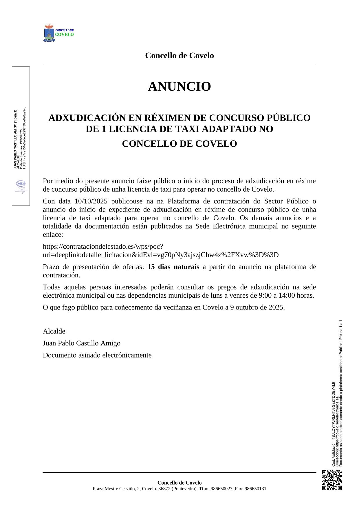 O Concello de Covelo informa do inicio do proceso de adxudicación, mediante concurso público, dunha licenza de taxi adaptado para operar no municipio. O prazo de solicitude remata o luns 27 de outubro de 2025.