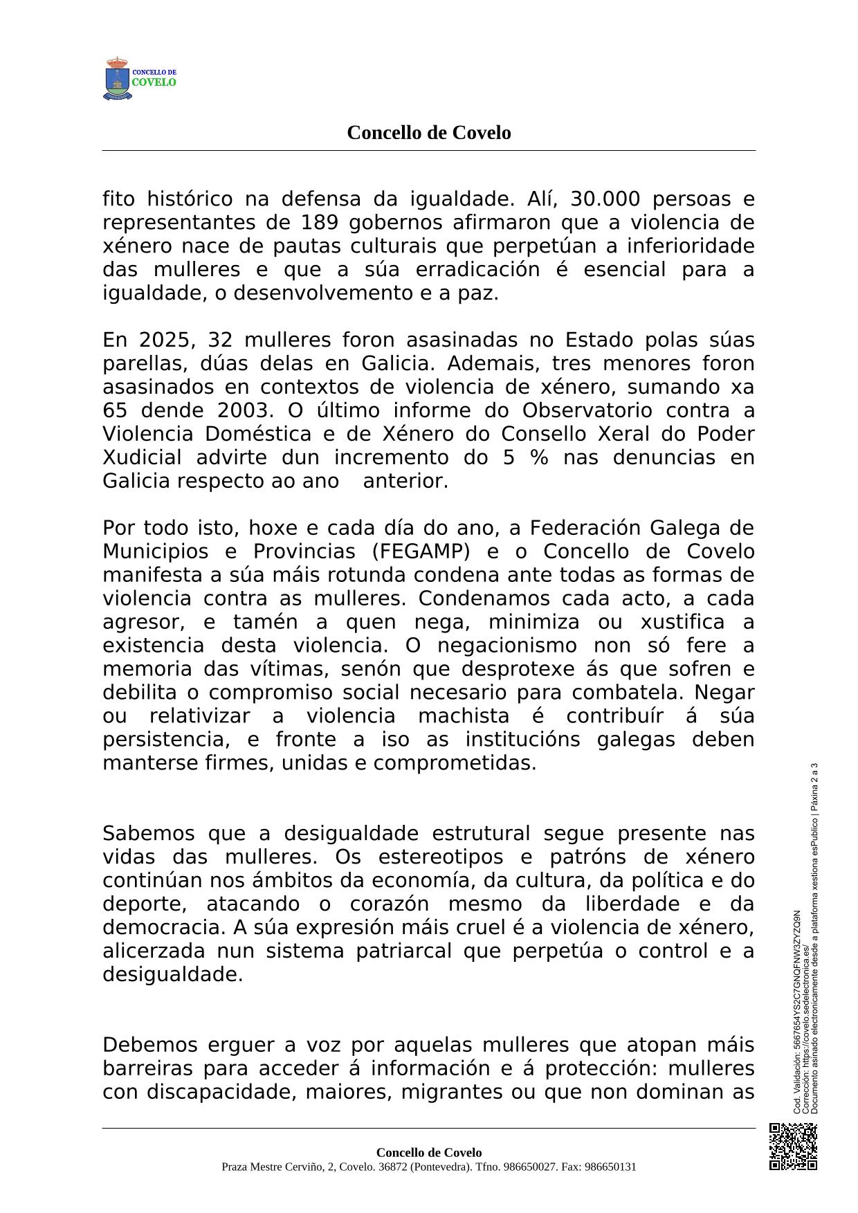 El Pleno del Ayuntamiento de Covelo aprobó por unanimidad a declaración de la FEGAMP contra la violencia machista.