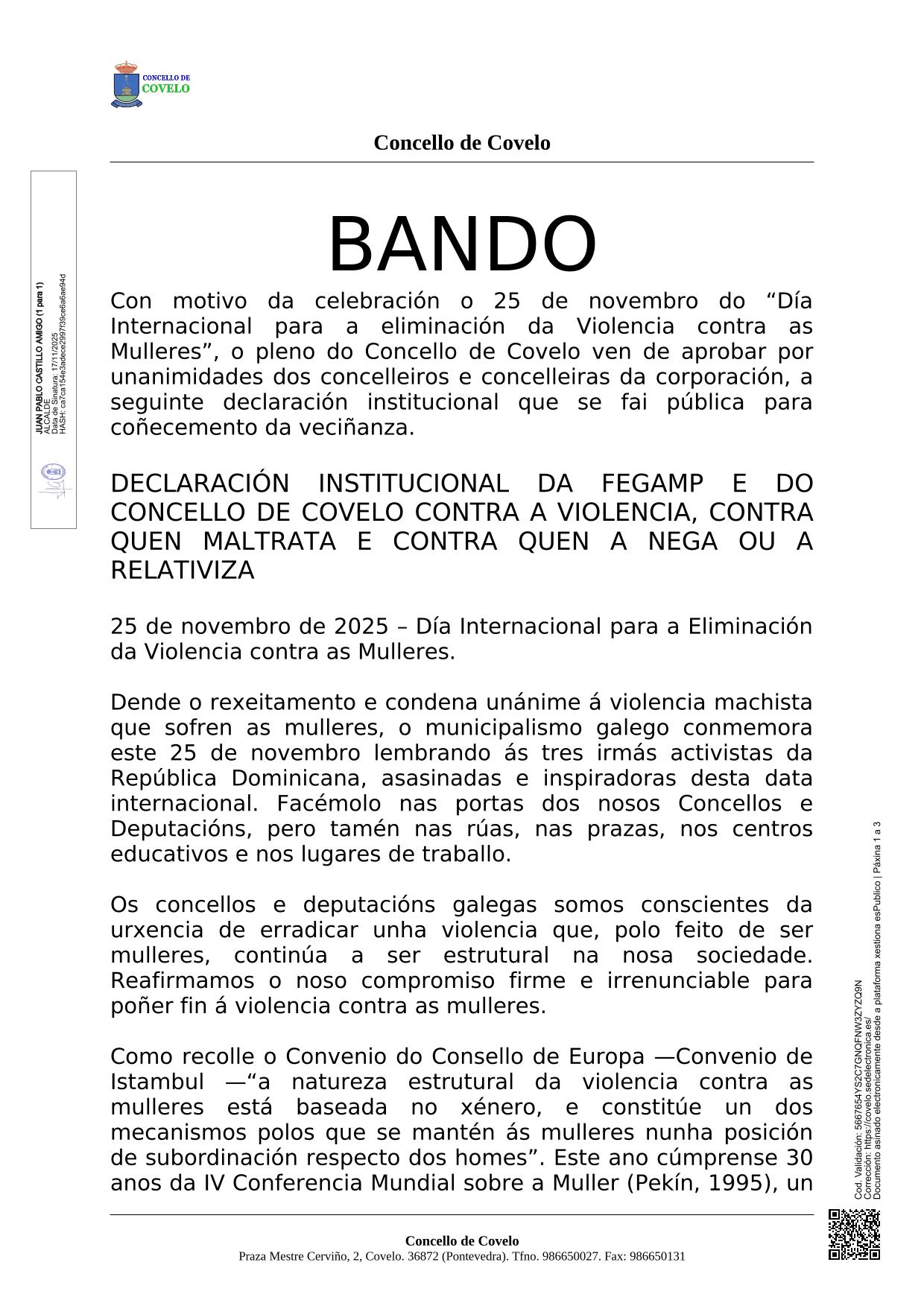 O Pleno do Concello de Covelo aprobou por unanimidade a declaración da FEGAMP contra a violencia machista.