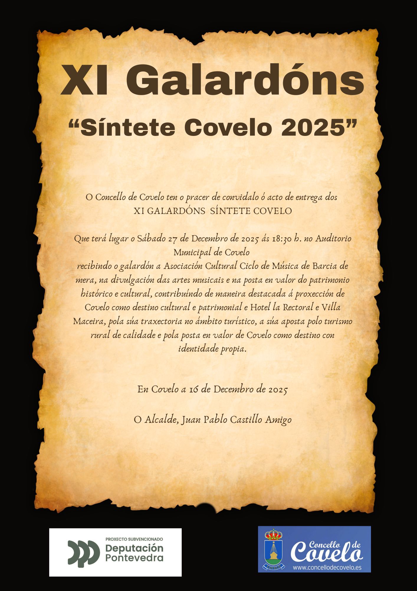 A gala de entrega dos galardóns celebrarase o sábado 27 de decembro de 2025, ás 18:30 horas, no Auditorio Municipal de Covelo, nun acto público aberto á veciñanza.