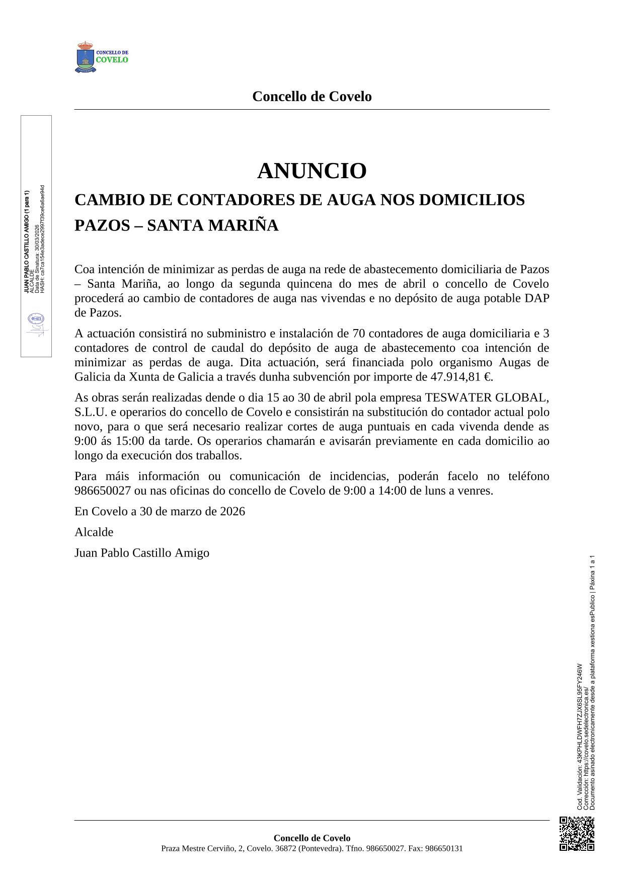 O Concello de Covelo realizará a substitución de contadores de auga nas vivendas e no depósito de abastecemento para reducir perdas na rede.