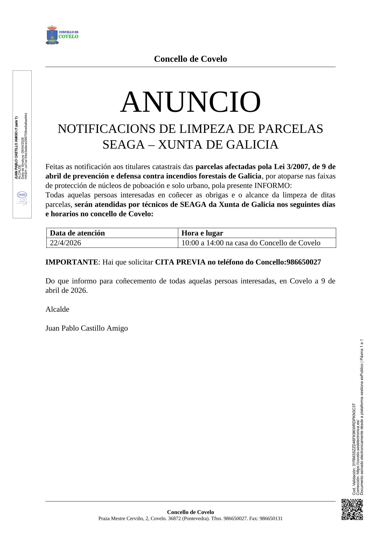 Hai que solicitar CITA PREVIA no teléfono do concello 986650027.