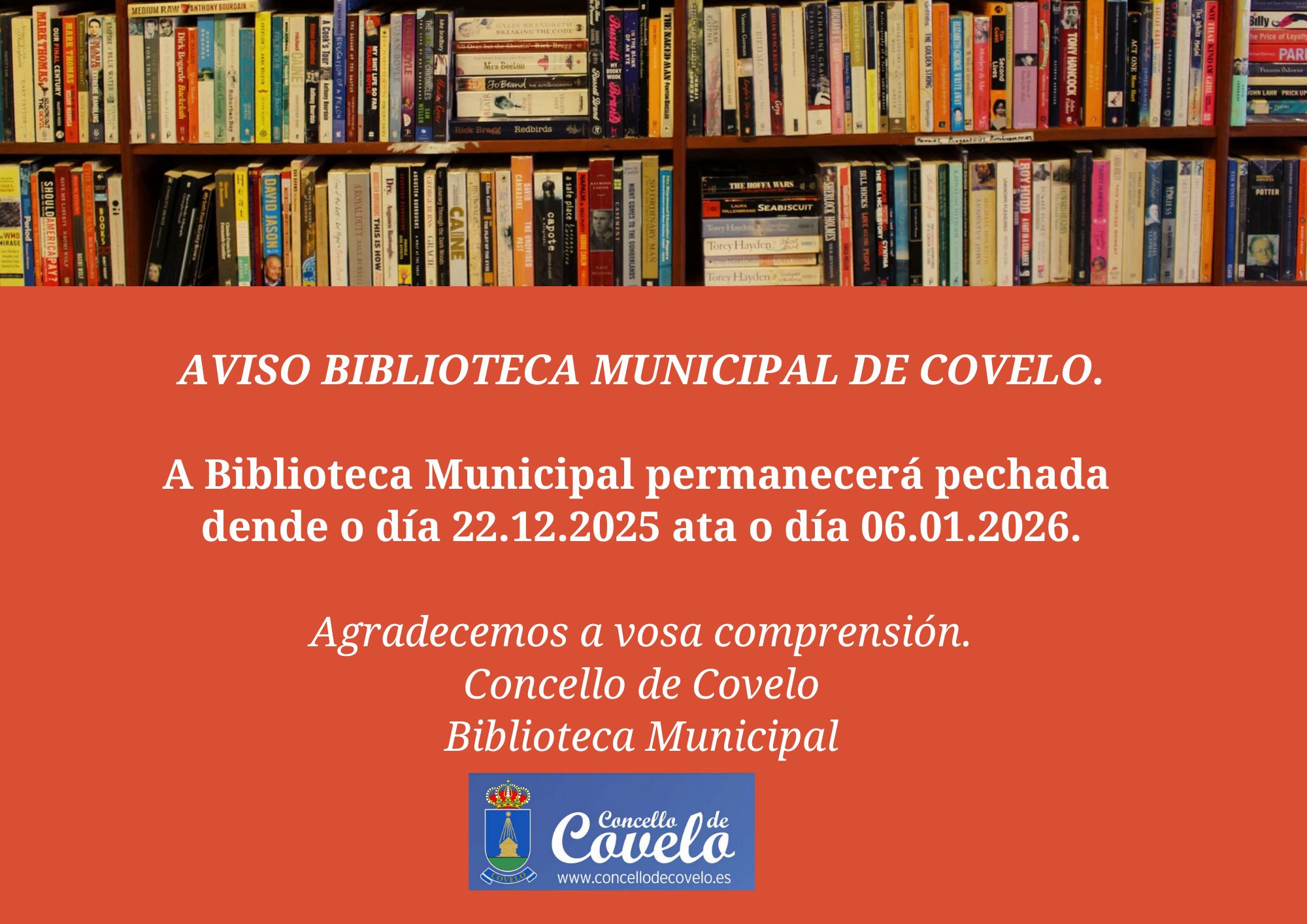 A Biblioteca Municipal de Covelo permanecerá pechada dende o día 22 de decembro de 2025 ata o día 6 de xaneiro de 2026.