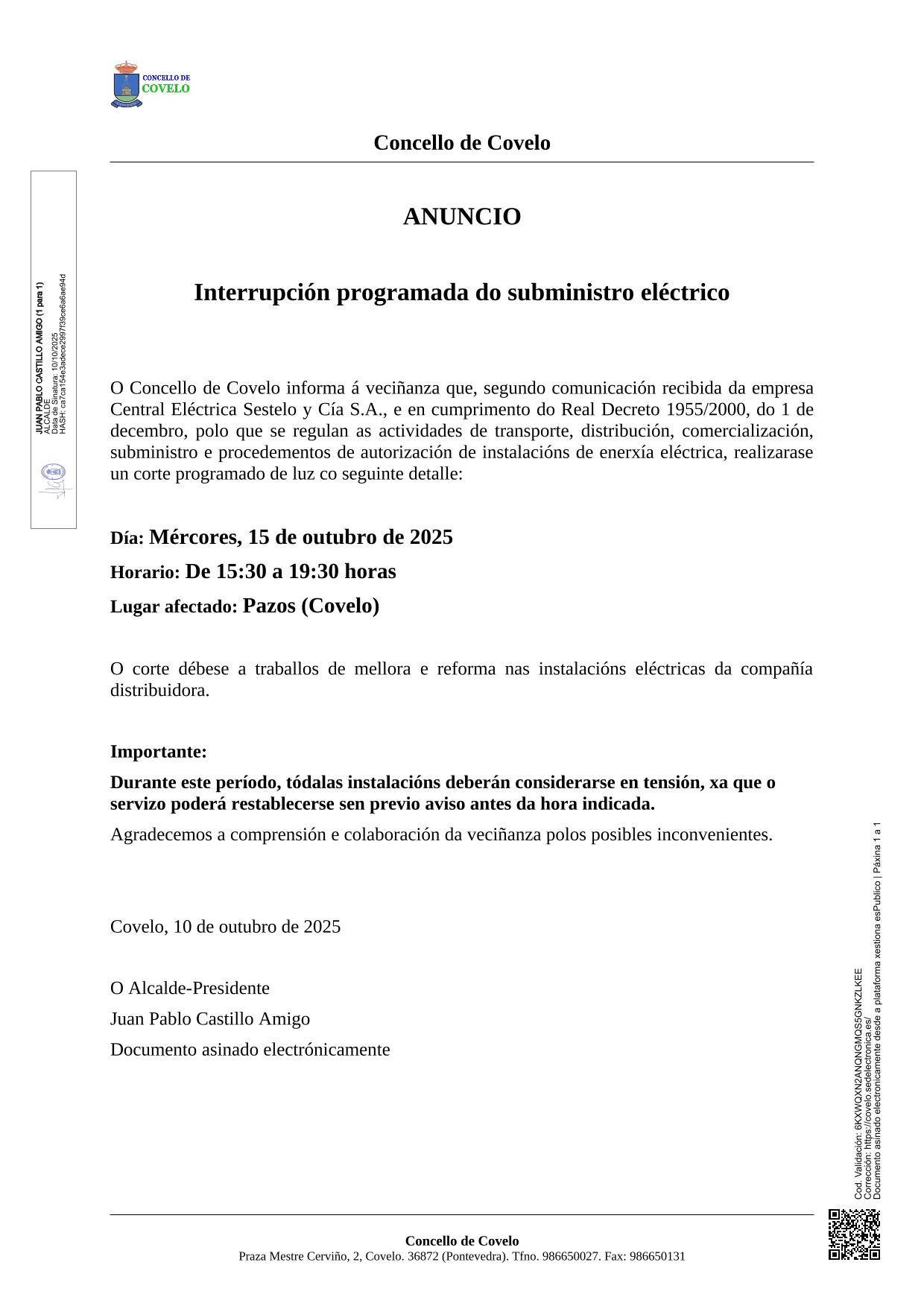 A empresa distribuidora Central Eléctrica Sestelo y Cía S.A. realizará traballos de mellora na rede eléctrica.