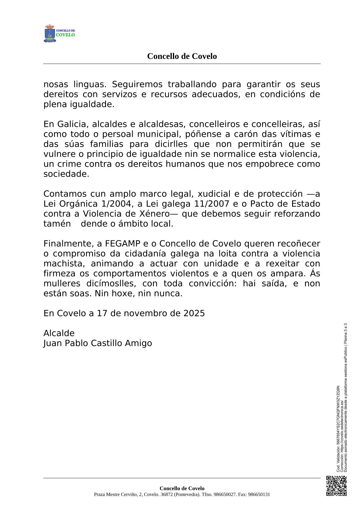 Condenamos toda forma de violencia, o machismo e o negacionismo, e reafirmamos o compromiso de apoiar ás vítimas e defender a igualdade.