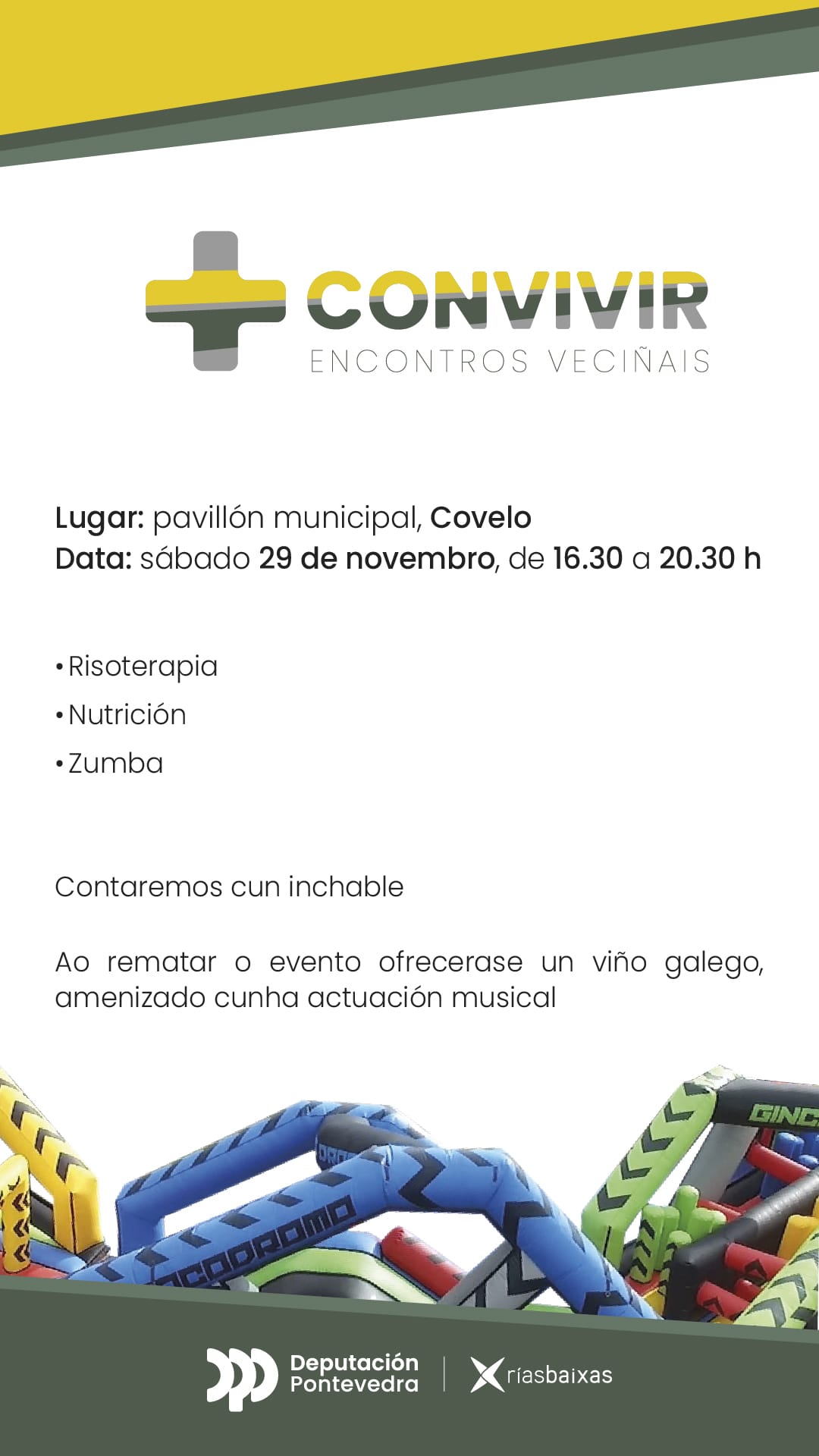 El programa Más Convivir llega a Covelo con el objetivo de promover el bienestar, la participación social y el encuentro entre vecinos y vecinas a través de actividades saludables, dinámicas y pensadas para todas las edades. Un espacio para cuidar el cuerpo, la mente y la comunidad, creando momentos compartidos que fortalecen la convivencia y fomentan un estilo de vida activo y positivo. Podréis participar en las actividades incluidas en el programa: