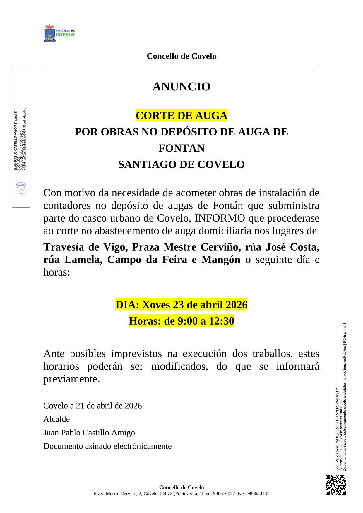 Aviso de corte de auga en Covelo.