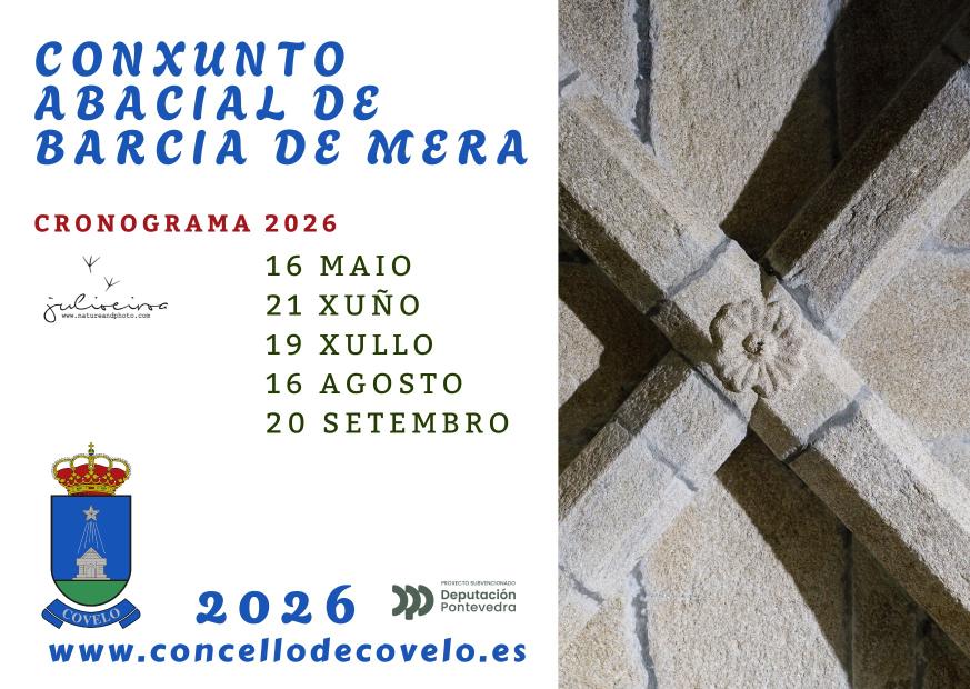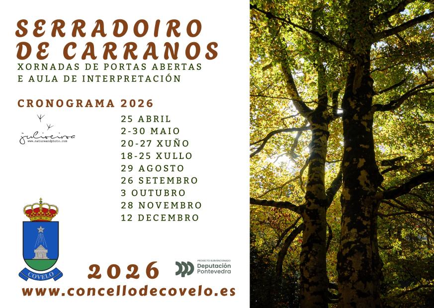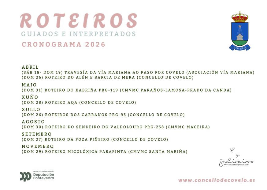 CRONOGRAMA RUTAS 2026 AQUÍ. CRONOGRAMA VISITAS CONXUNTO ABACIAL DE BARCIA DE MERA AQUÍ. CONOGRAMA VISITRAS SERRADOIRO DOS CARRANOS AQUÍ. Covelo é o sitio ideal para rutas, miradoiros naturais de situación extraordinaria, prados verdes, bosques autótonos, fervenzas, regatos; paraxes naturais de bondadosa beleza... estas características particulares convérteno nun lugar ideal para todo o que signifique práctica de turismo verde. O Concello de Covelo conta có RMR. A Rede Municipal de Roteiros é una plataforma dixital que reúne a información técnica dos roteiros dependentes do Concello e das Comunidades de Montes Veciñais en Man Común (CMVCM). Nesta páxina, e no seguinte enlace, poderá atopar toda a información necesaria para recorrer estos sendeiros. Algunhas delas Audioguias Rutas MP3. ![]() |